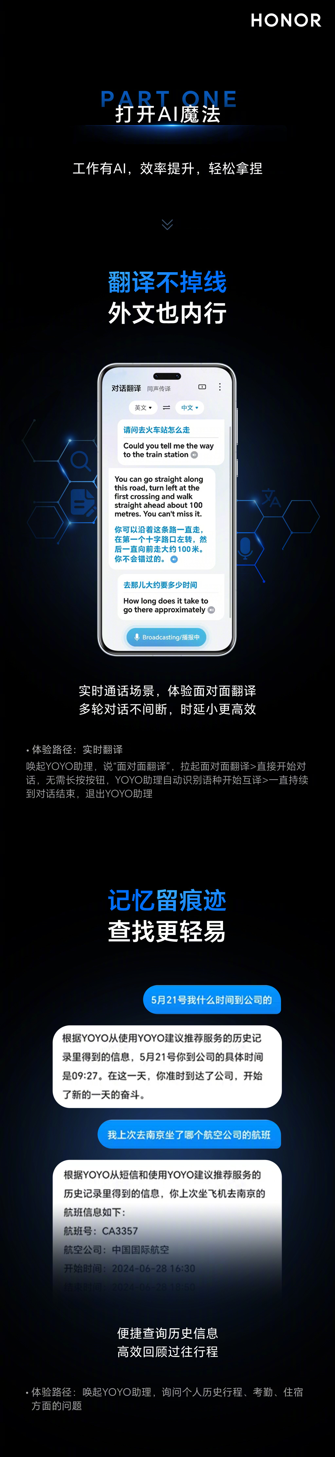 荣耀官方今日发文对新机进行预热,Magic7 系列手机将支持多项 AI 功能,包括 YOYO 助理自动操作、端云协同导航、实时翻译等功能。IT之家整理功能情况如下: