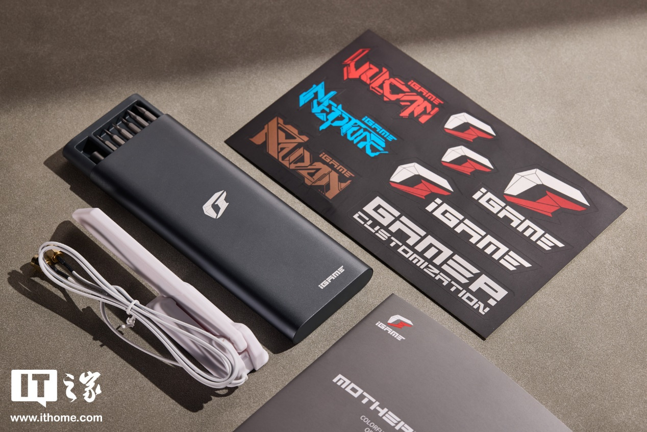 七彩虹 iGAME Z890 FLOW V20 主板定位次旗舰主板,配件自然保持了丰富和实用的风格,除了标配的各种线材、跳线收纳头、增补螺柱包外,还附送了一盒黑色螺丝刀、一个黑色金属优盘以及 iGAME 风格贴纸。外置 Wi-Fi7 增强天线为纯白色,与主板色调保持一致,支持磁吸,配件整体都很实用。