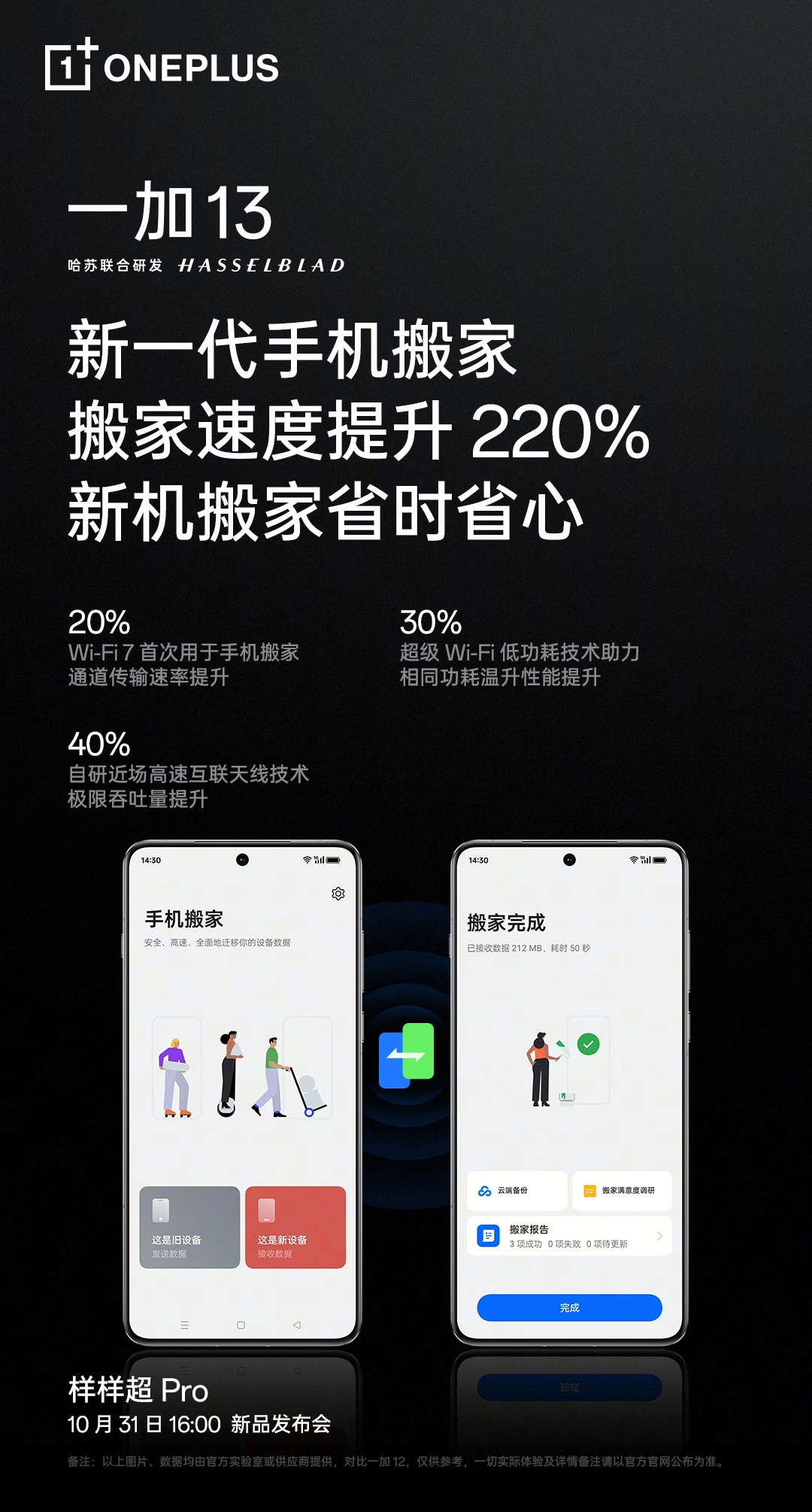 IT之家 10 月 27 日消息,一加 13 手机将于 10 月 31 日 16:00 发布,官方今日宣布,一加 13 支持新一代手机搬家,速度提升 220%。