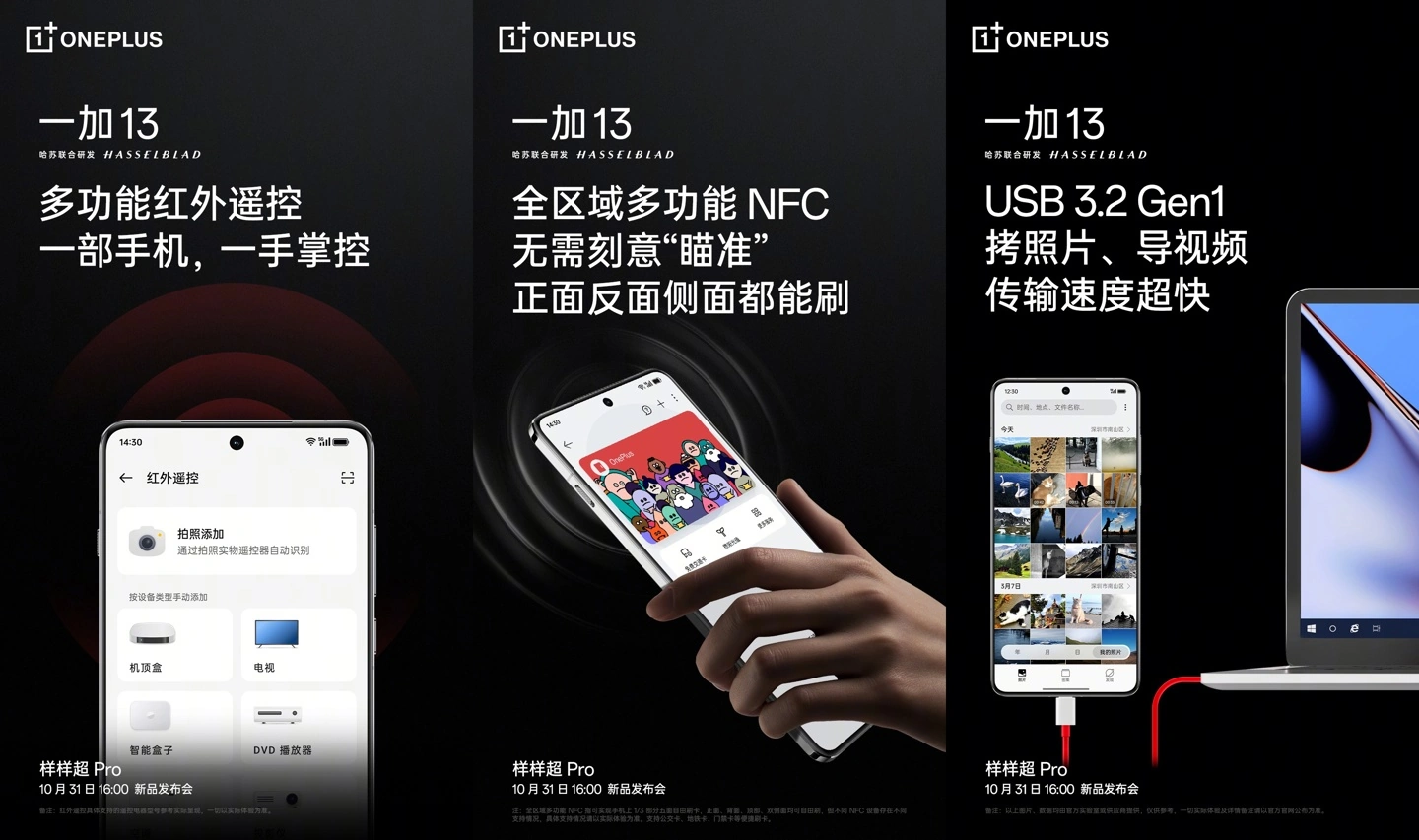 此外,一加 13 配备红外遥控、全区域多功能 NFC 等功能,支持 USB 3.2 Gen1。