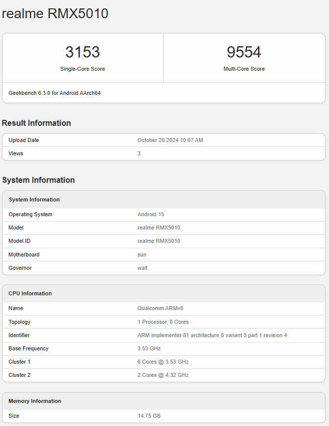 在 Geekbench 6.3.0 版本中,这款新机取得了单核 3153 分、多核 9554 分的成绩,CPU 为 6 Cores @ 3.53 GHz+2 Cores @ 4.32 GHz,与本月发布的骁龙 8 至尊版处理器保持一致。