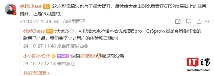 IT之家注意到,徐起在该微博评论区下称“这次影像算法也有了很大提升,后续给大家出对比看看在 GT5 Pro 基础上的效果提升,还是很明显的。”