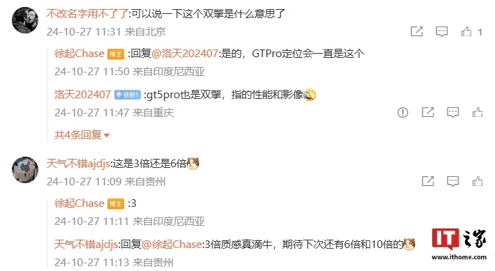 另外,徐起还在评论区中回复了部分网友的问题:针对 320W 快充版本机型的缺失,他表示“技术还只能配 4600 电池等我们再把电池搞大点”;针对真我手机“双擎”的含义,他称“GT Pro 定位会一直是这个(性能和影像)”;针对新机长焦是 3 倍还是 6 倍,他直言“3”。