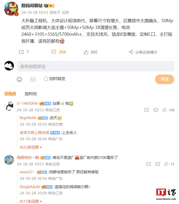 IT之家 10 月 28 日消息,博主 @数码闲聊站 今日发文透露,“某厂”大折叠工程机大体设计延续前代,屏幕尺寸有增大。该机后置居中大圆镜头,50Mp 哈苏大师影调大底主摄 + 50Mp + 50Mp 3X 潜望长焦。