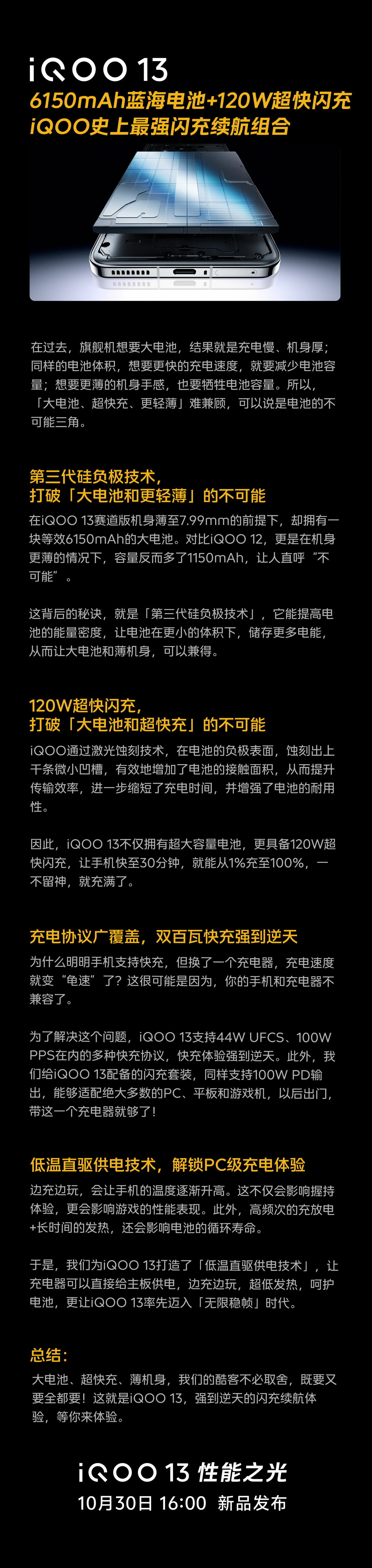 iQOO 官方现对新机电池技术和充电能力作出解读: iQOO 13 手机的电池采用“第三代硅负极技术”,电池体积得到缩小;iQOO 还通过激光蚀刻技术在电池负极表面蚀刻出上千条微小凹槽,缩短了手机充电时间、增强电池耐用性,宣称“30 分钟可从 1% 充至 100%”。