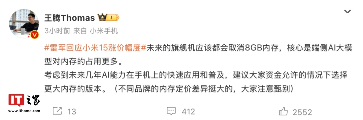 文章来源于互联网:IT之家-小米王腾:未来旗舰机应该都会取消 8GB RAM,核心是端侧 AI 大模型占用更多