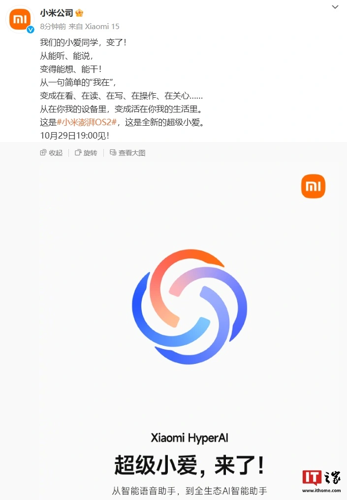 IT之家 10 月 29 日消息,小米官方今日发文宣布,旗下小爱同学的升级版本“超级小爱”将在今晚的发布会上亮相,官方宣称“从智能语音助手,到全生态 AI 智能助手”。