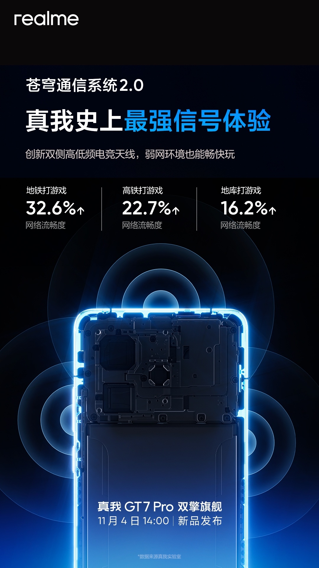 IT之家 10 月 29 日消息, realme 真我手机今日继续对将于 11 月 4 日发布的 GT7 Pro 进行预热,新机将首发“苍穹通信系统 2.0”,支持弱网场景游戏在线特性。