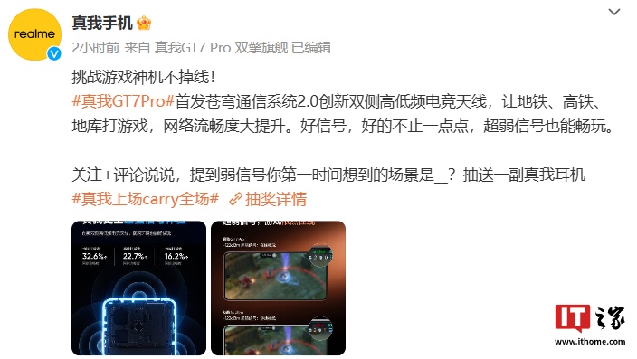 文章来源于互联网:IT之家-realme 真我 GT7 Pro 手机首发“苍穹通信系统 2.0”:支持弱网场景游戏在线特性
