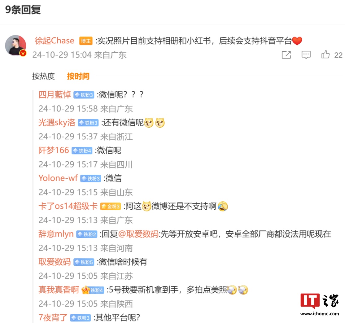 另外,徐起还在评论区中对该功能进行补充说明:实况照片目前支持相册和小红书,后续会支持抖音平台。