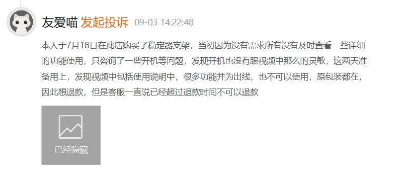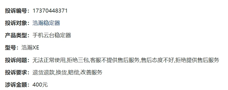 文章来源于互联网:凤凰网-消费者投诉:hohem浩瀚手机云台稳定器功能不稳定 客服态度恶劣