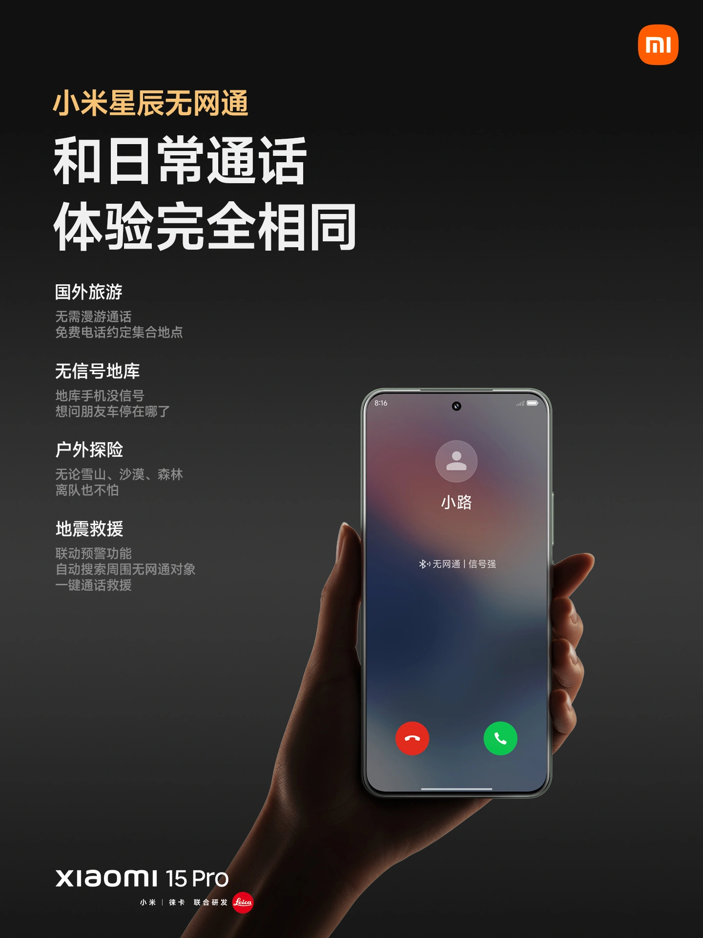 该技术由小米 15 Pro 首发搭载,支持“行业首个公里级无网通话”,半径 3.5km 内完全无网也能双向通话。