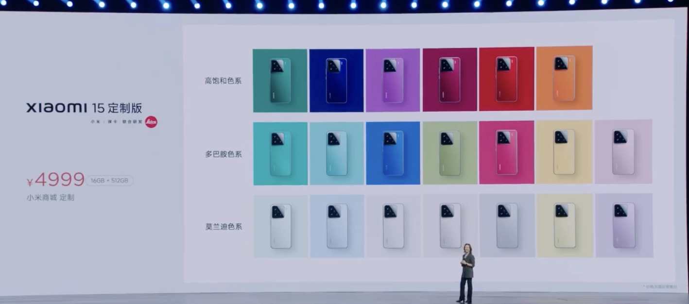 IT之家 10 月 29 日消息,在目前正在进行的小米 15 系列暨小米澎湃 OS 2 新品发布会中,小米公布了小米 15 定制色版,仅提供 16GB RAM + 512GB 储存空间版本,需在小米商城定制,可选 20 种颜色 40 种搭配,定价为 4999 元。