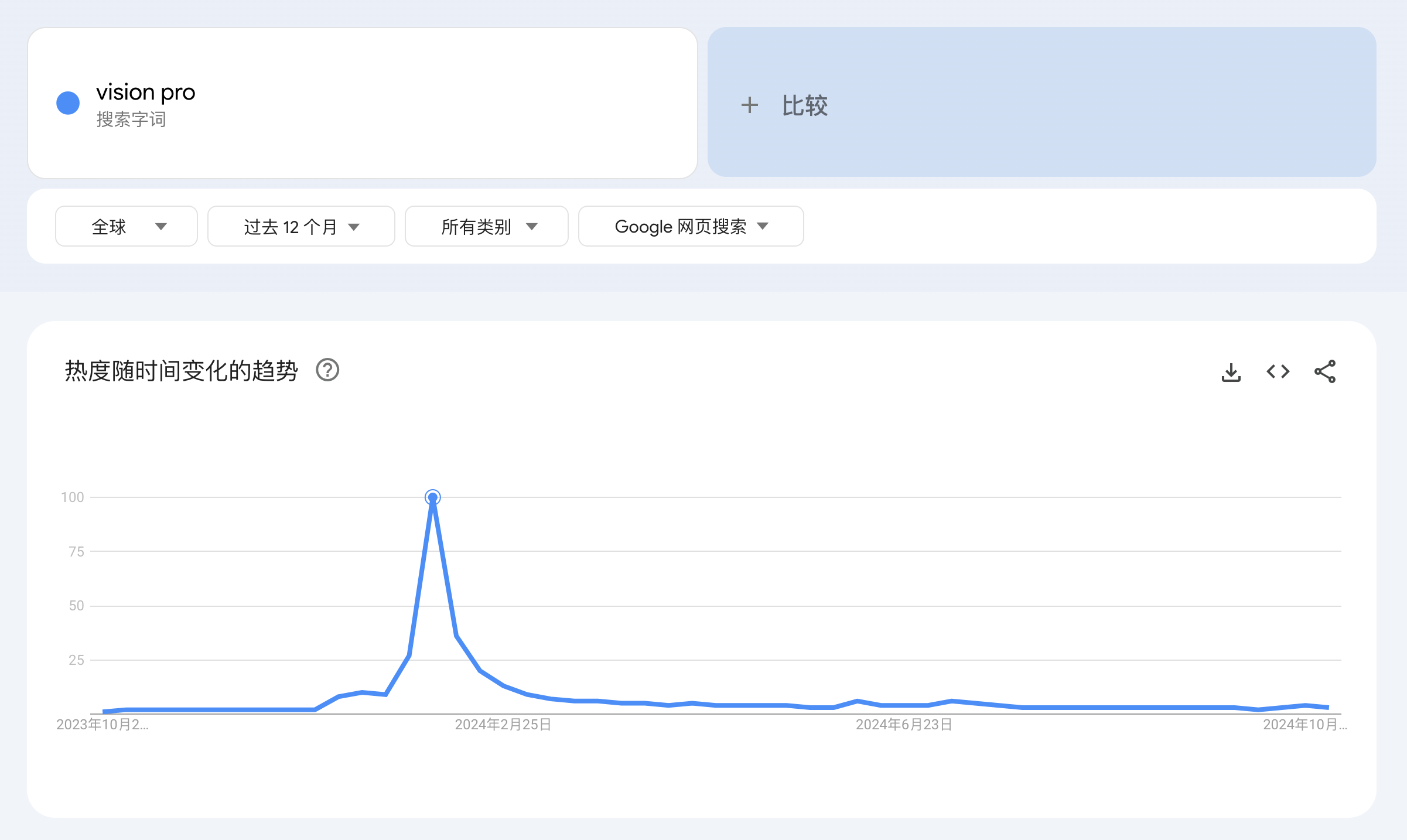 首先是大众的反馈,从发售之初的热烈到迅速冷却,今天更是没有多少人关注。一方面是作为媒体从业者,可以明显感受 Vision Pro 除了全球开售的时间点,Vision Pro 确实是无人问津。另一方面从谷歌趋势也能看出,全球消费者对 Vision Pro 的关注: