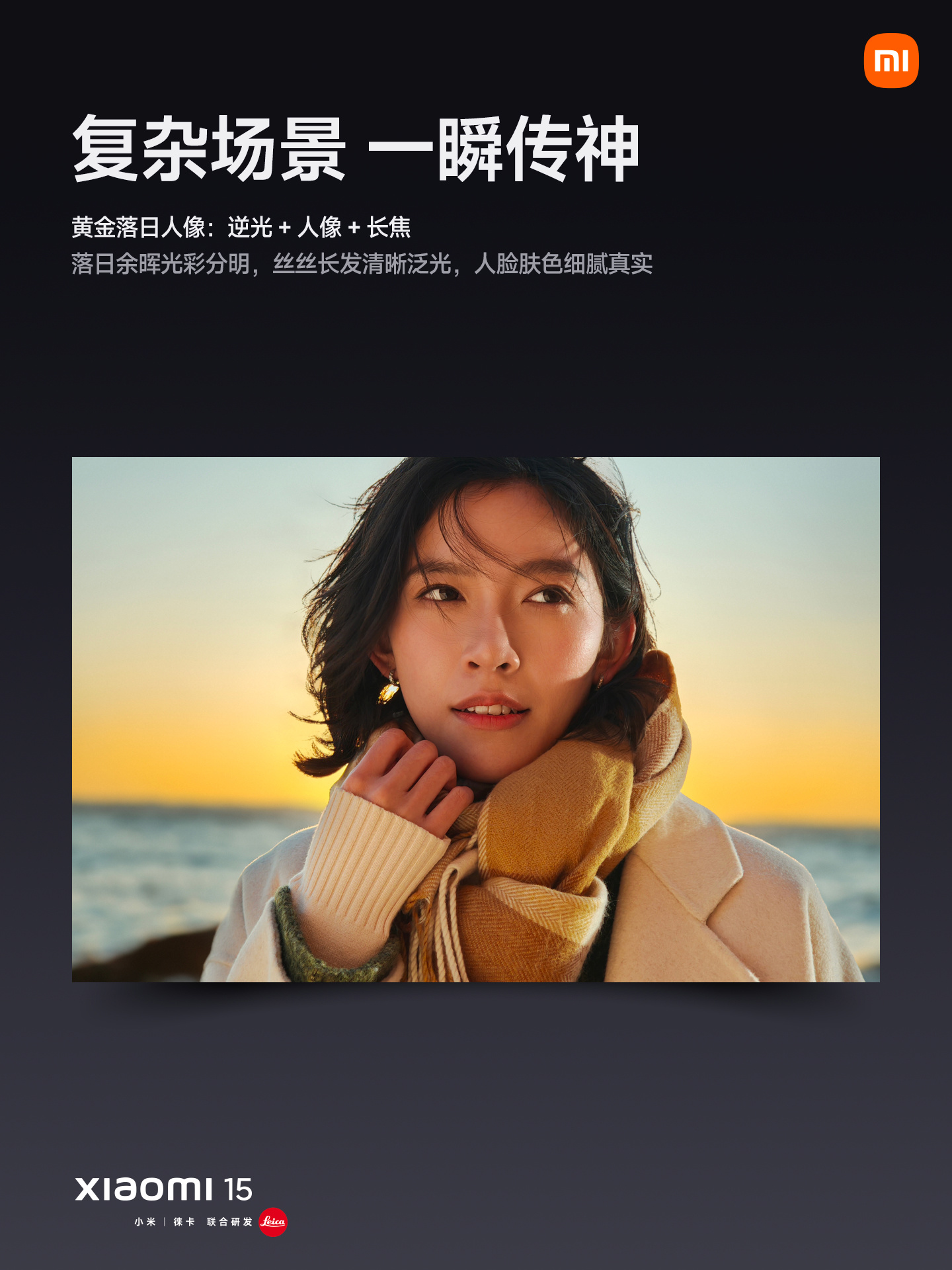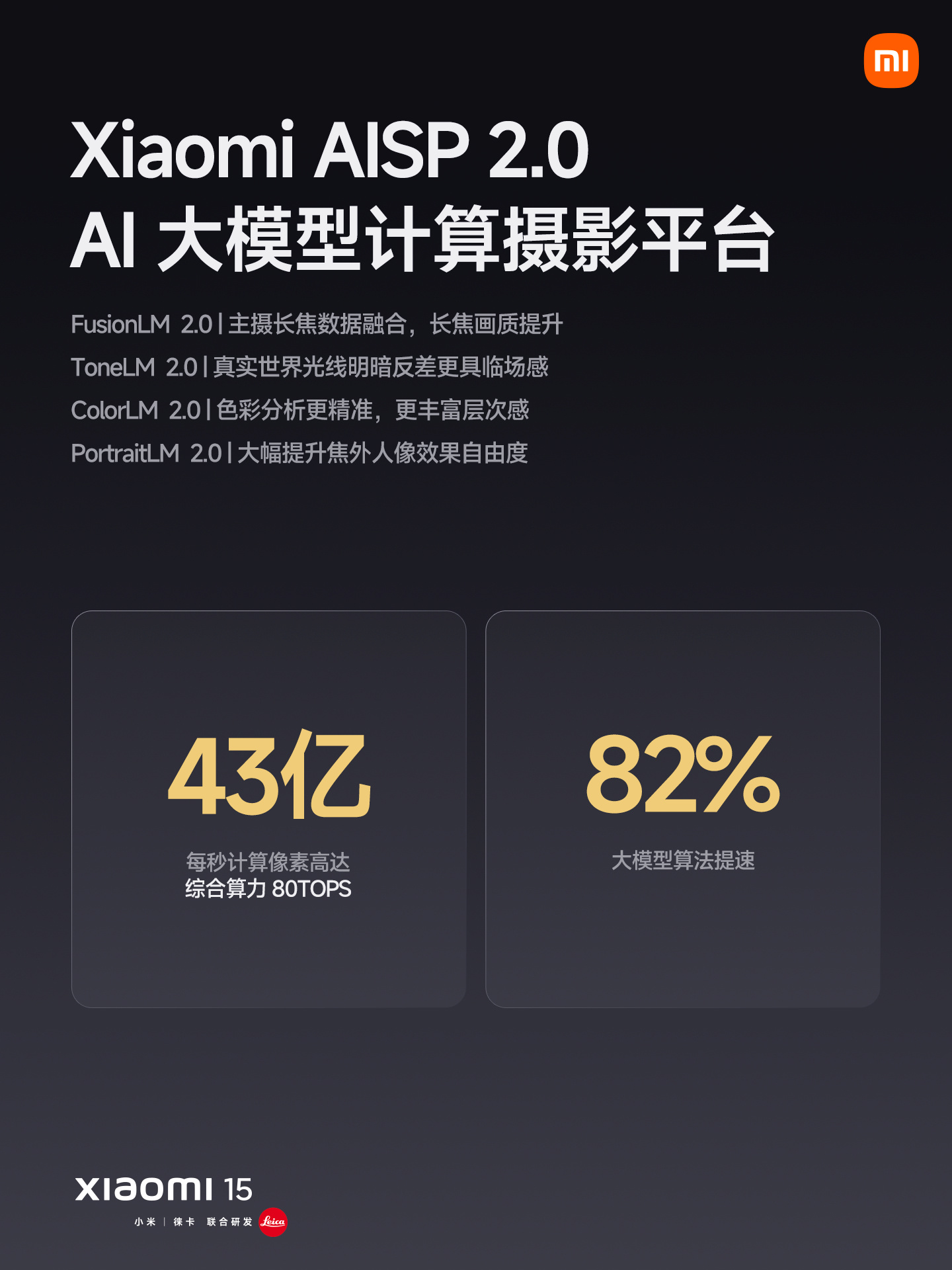 据介绍,小米 15 手机内置 Xiaomi AISP 2.0 AI 大模型计算摄影平台,每秒可计算 43 亿像素、综合算力 80TOPS,同时算法提速 82%。新机升级“黄金落日人像”拍摄,支持逆光 + 人像 + 长焦拍摄。