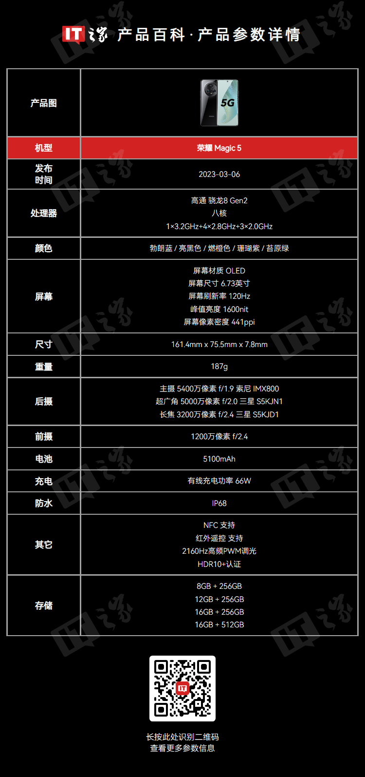 荣耀 Magic5 手机发布于 2023 年 3 月 6 日,搭载骁龙 8 Gen 2 处理器 + LPDDR5X 内存 + UFS 3.1 闪存,12+256G 版发售价为 4499 元。