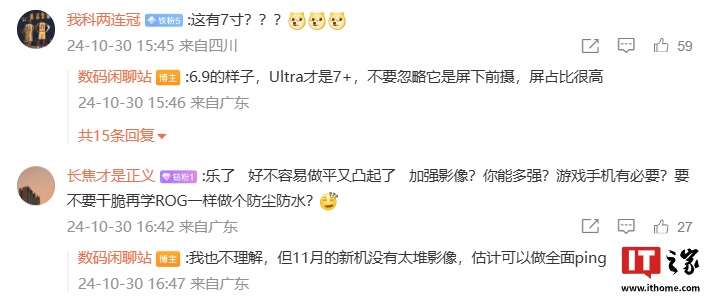 IT之家注意到,博主针对部分网友的问题进行了解答:针对新机的尺寸,他回复“6.9 的样子,Ultra 才是 7+,不要忽略它是屏下前摄,屏占比很高”;针对相机凸起问题,他称“但 11 月的新机没有太堆影像,估计可以做全面 ping”。