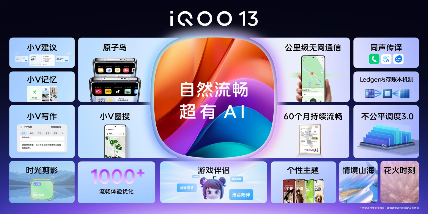 新机搭载 OriginOS 5 系统,号称“超 1000 项流畅体验优化,60 个月持续流畅”,iQOO 13 还支持 OriginOS 系统 AI 功能,全面升级的五大模型,支持小 V 圈搜、小 V 记忆、小 V 写作、小 V 建议等功能。另外,新机还支持原子岛功能,支持长按短视频口令并拖拽到顶部,出现对应视频。