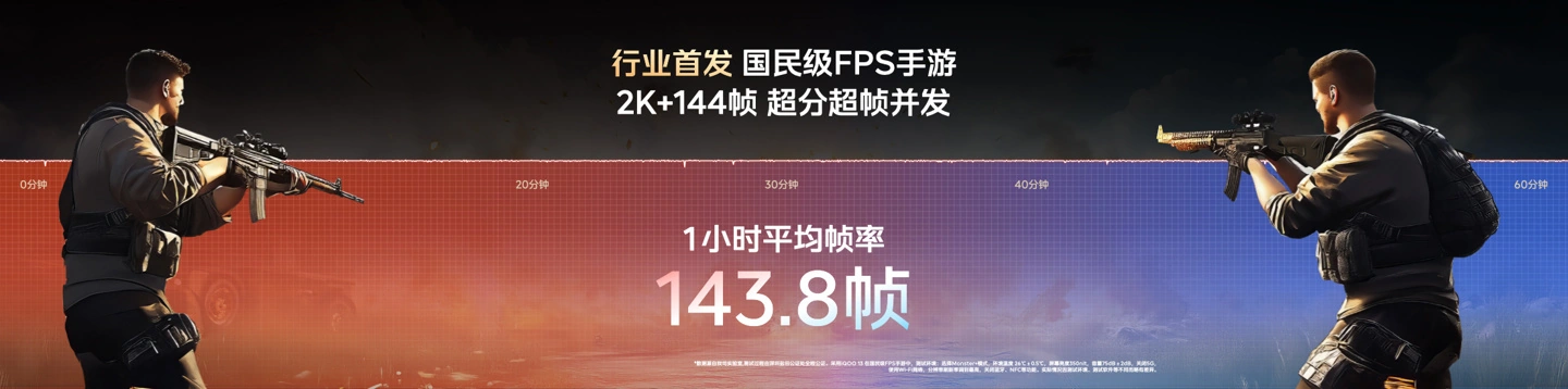 iQOO 13 手机还支持 2K+144Hz 超分超帧并发,行业首发国民级 FPS 手游 2K+144 帧超分超帧并发,1 小时平均帧率 143.8 帧。iQOO 13 手机还支持 140 + 款超帧游戏、100 + 款超分游戏、98 款超分超帧并发游戏。