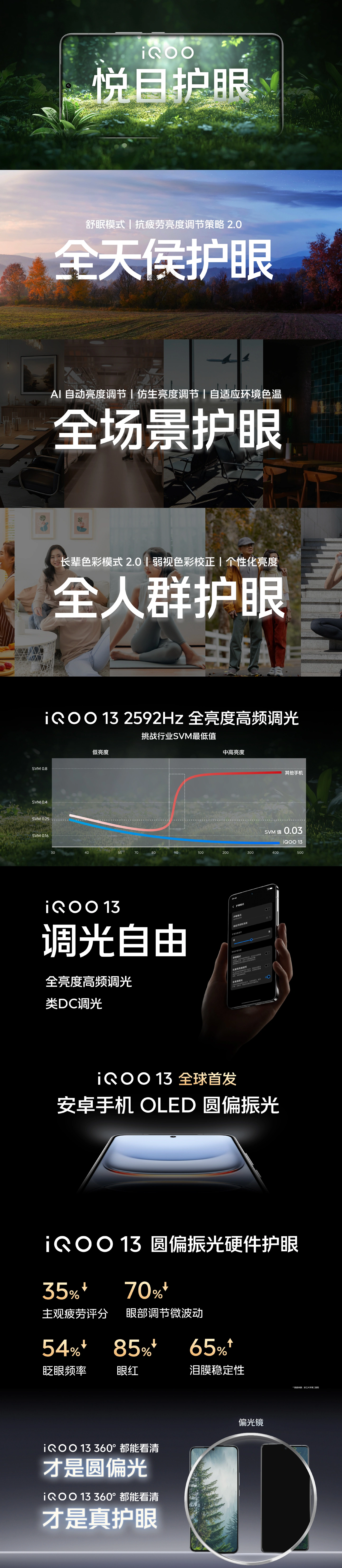 新机搭载 vivo 自研「悦目护眼」,支持全天候护眼、全场景护眼、全人群护眼。iQOO 13 支持 2592Hz 全亮度高频调光、类 DC 调光。新机还全球首发安卓手机 OLED 圆偏振光,号称“显著缓解视疲劳,明显减轻干眼、眼红症状”。