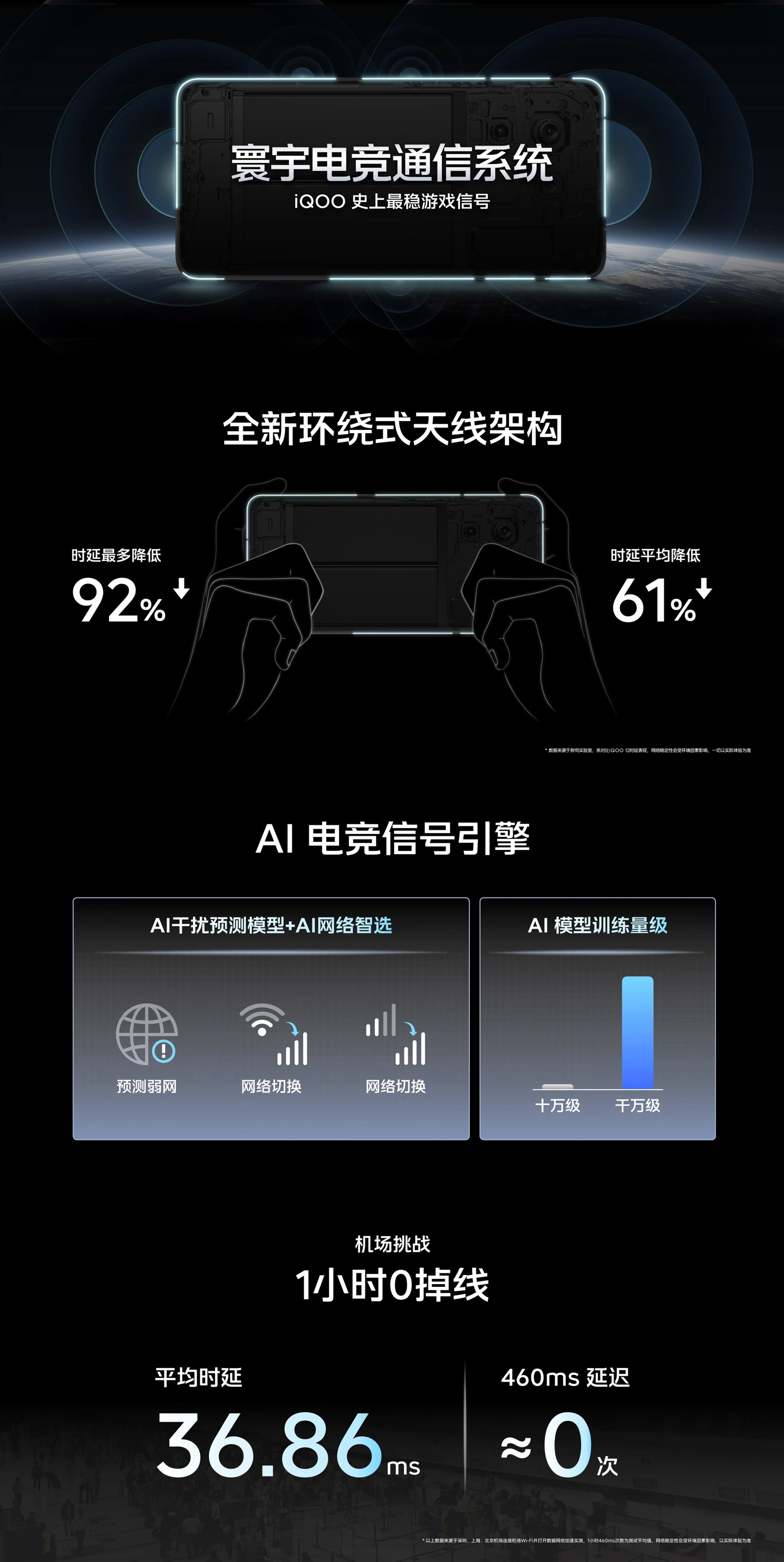 iQOO 13 手机还配备「寰宇电竞通信系统」,采用全新的 360° 环绕式天线,号称用不同的手握姿势,即使在信号较弱的场景,iQOO 13 的时延最多降低 92%,平均降低 61%。新机还拥有「AI 电竞信号引擎」,支持预测 Wi-Fi 和数据网络的状态,提前规避异常,降低时延。