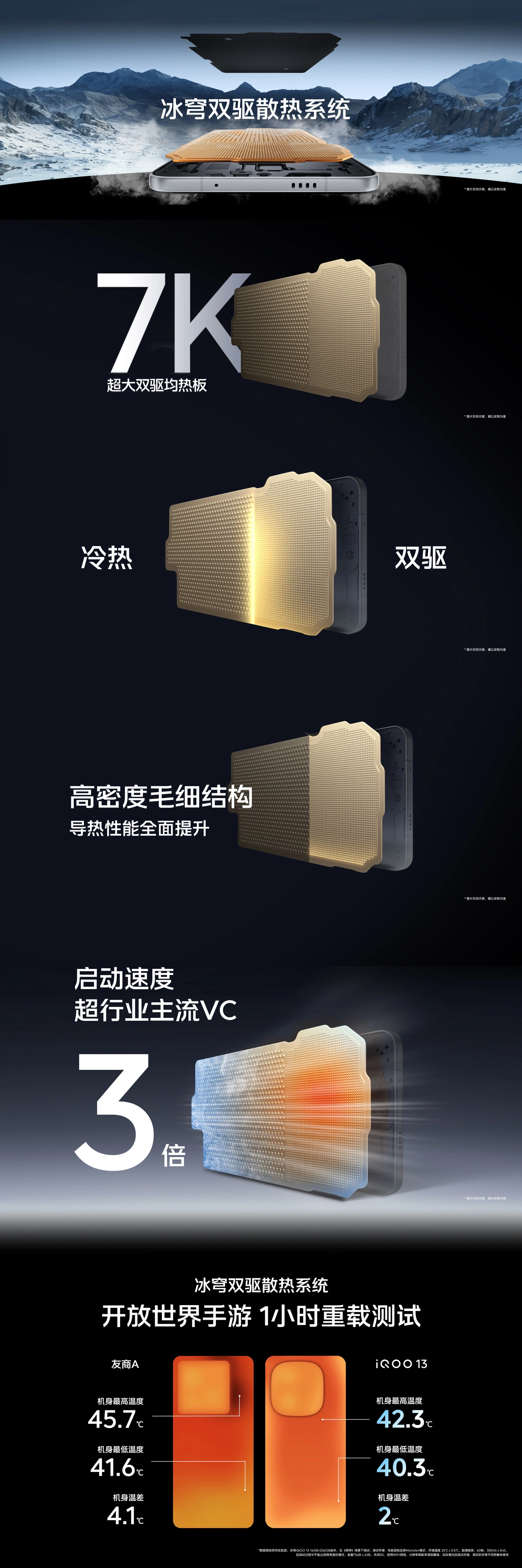 iQOO 13 手机拥有 7K 双驱均热板,将均热板分为冷热双驱,热驱覆盖核心热源,响应启动更快速、更灵敏,启动速度比行业主流 VC 快 3 倍,提升热循环效率。室温下测试《开放世界手游》1 小时之后,新机机身最高温度为 42.3℃,温差约 2℃。