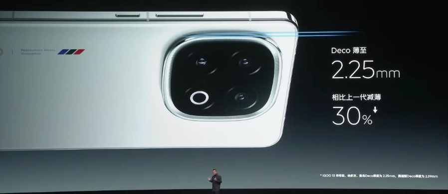 iQOO 13 的后置相机 Deco 厚度约 2.25mm,相比上代减少 30%。手机还拥有能量光环设计,默认关闭,自由开启,适配游戏场景氛围效果,支持颜色、场景、动态、72 种效果。新机还使用圆润直角金属中框 + 微四曲背板。