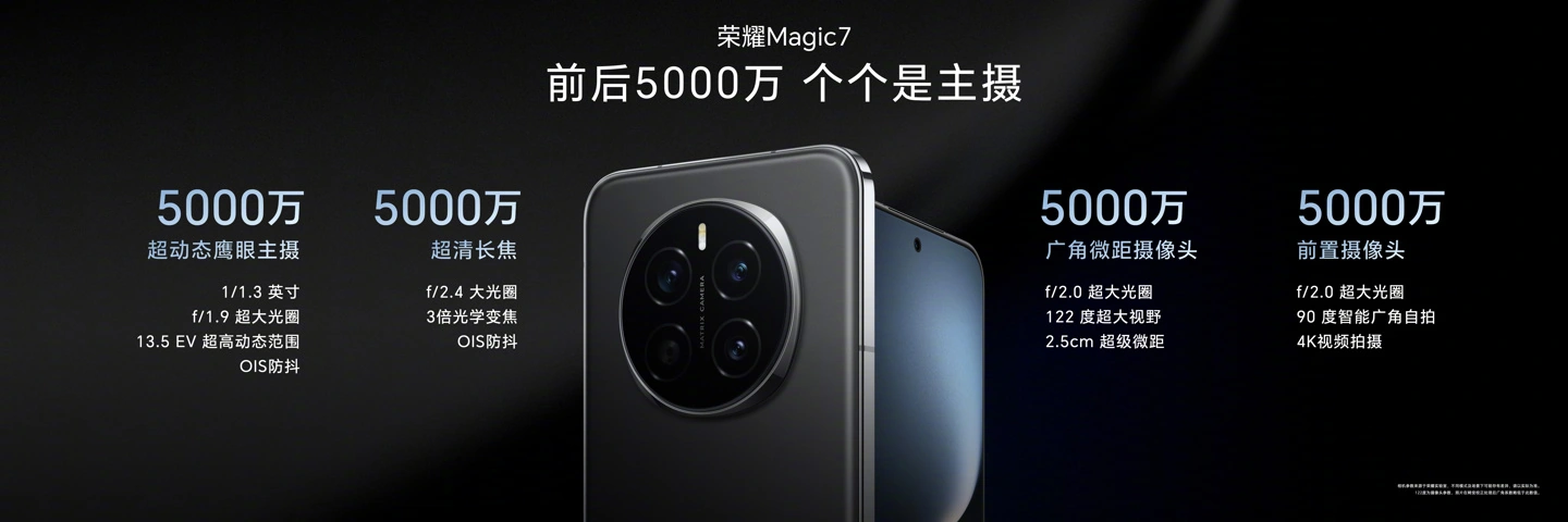 影像方面,荣耀 Magic 7 前置 50MP 自拍镜头,后置 50MP(豪威 OVH9000,1/1.3″,F1.9,OIS)主摄 + 50MP 超广角 + 50MP 长焦(3 倍光学,50 倍数码,OIS)三摄。
