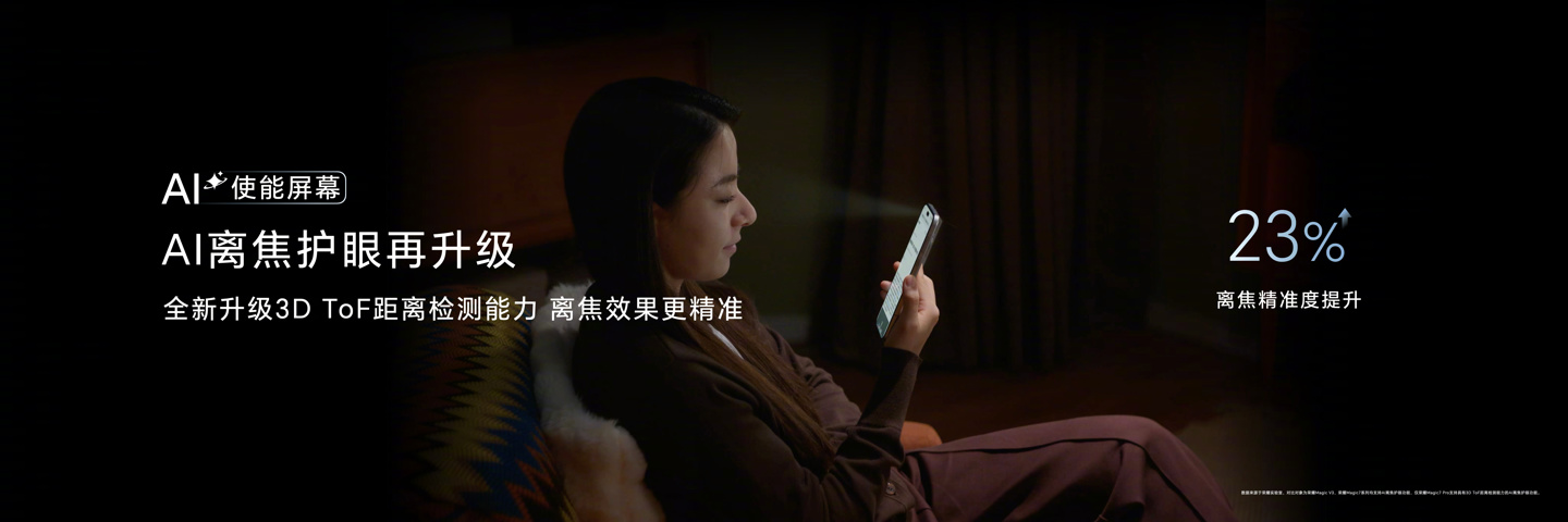 另外,荣耀 Magic7 系列手机还升级了 AI 离焦护眼,支持 3D ToF 距离检测能力,号称“离焦精准度提升 23%”;新机还通过德国莱茵 TÜV 全局护眼 4.0 认证,带来全局护眼新体验