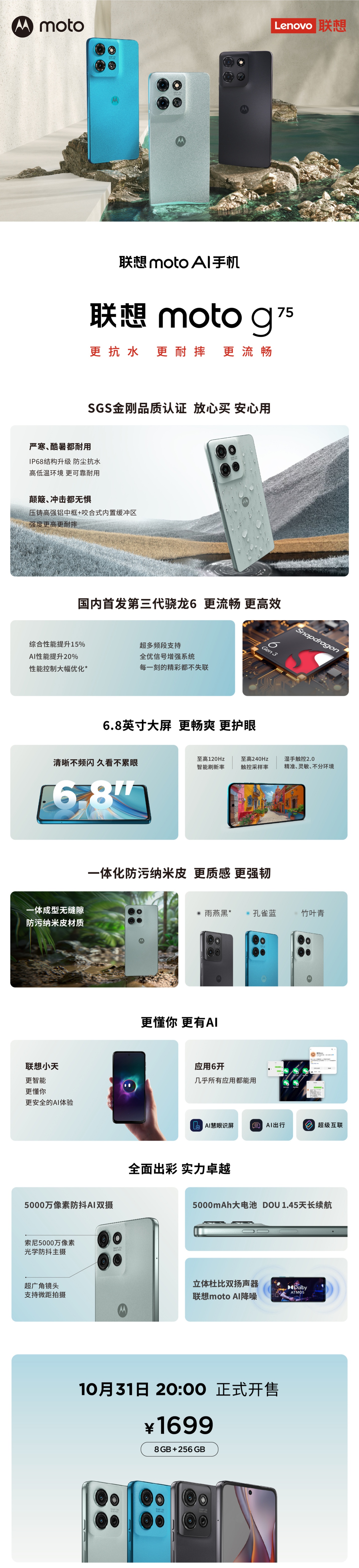 IT之家 10 月 30 日消息,联想 moto g75 手机国内首发第三代骁龙 6 处理器,8GB + 256GB 存储售价 1699 元,今日(10 月 31 日)20:00 正式开售。