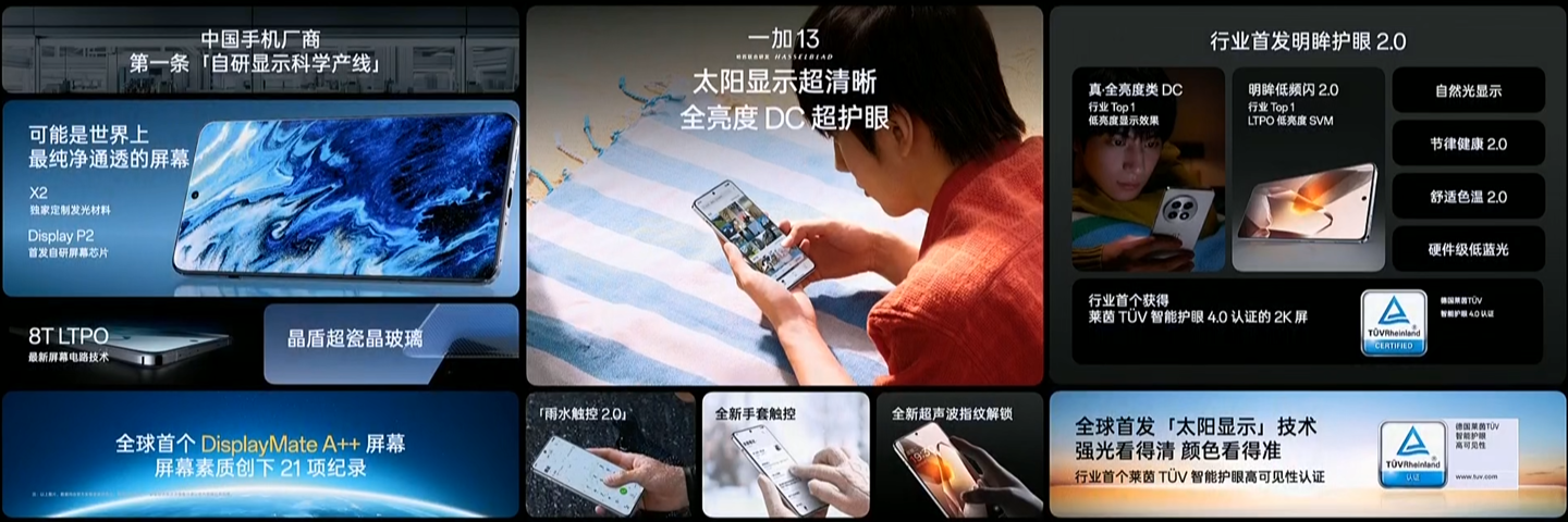 一加 13 首发第二代 2K 东方屏,搭载 6.82 英寸 2K 京东方 X2 最高定制等深四微弧直屏,支持 120Hz 8T LTPO 显示,还有“安卓唯一「太阳显示」技术”。