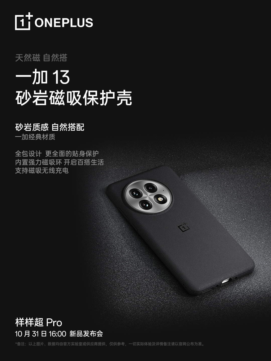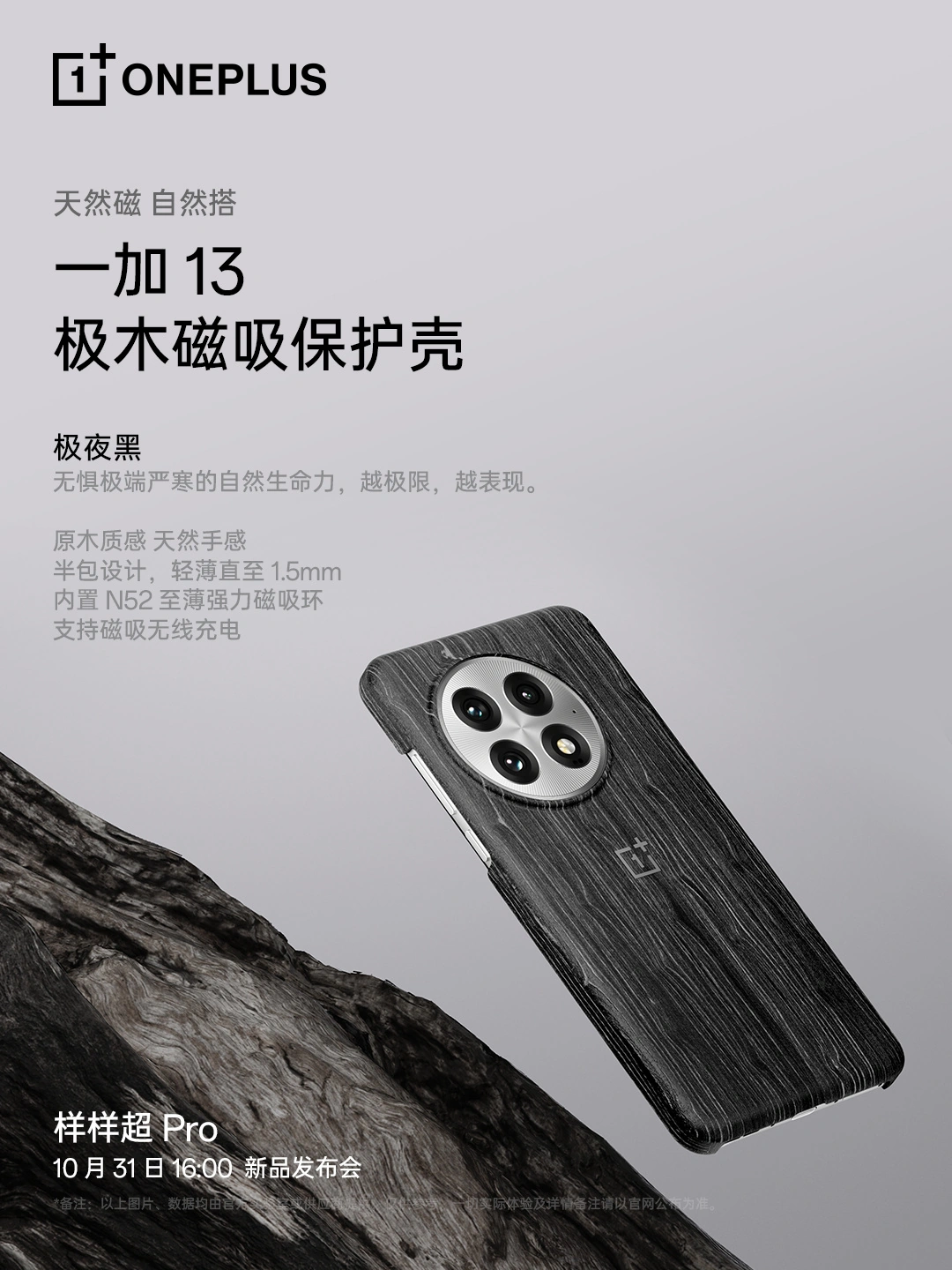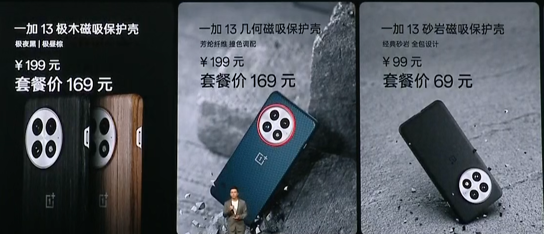 一加 13 拥有三款磁吸保护壳,分别为极木、几何芳纶纤维、经典砂岩: