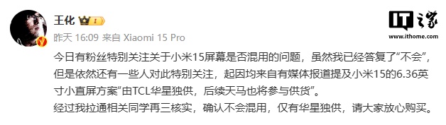 IT之家注意到,小米王化 10 月 30 日发文称,有媒体报道提及小米 15 的 6.36 英寸小直屏方案“由 TCL 华星独供,后续天马也将参与供货”,经过再三核实,确认不会混用,仅有华星独供,请大家放心购买。