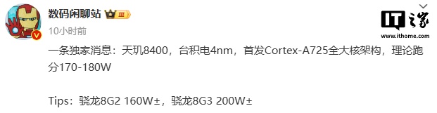 IT之家 10 月 31 日消息,据博主 @数码闲聊站 今日爆料,联发科天玑 8400 处理器将采用台积电 4nm 工艺,首发 Cortex-A725 全大核架构,理论跑分 170-180 万。作为对比,骁龙 8 Gen 2 和骁龙 8 Gen 3 的成绩分别为 160 万 ± 和 200 万 ±。