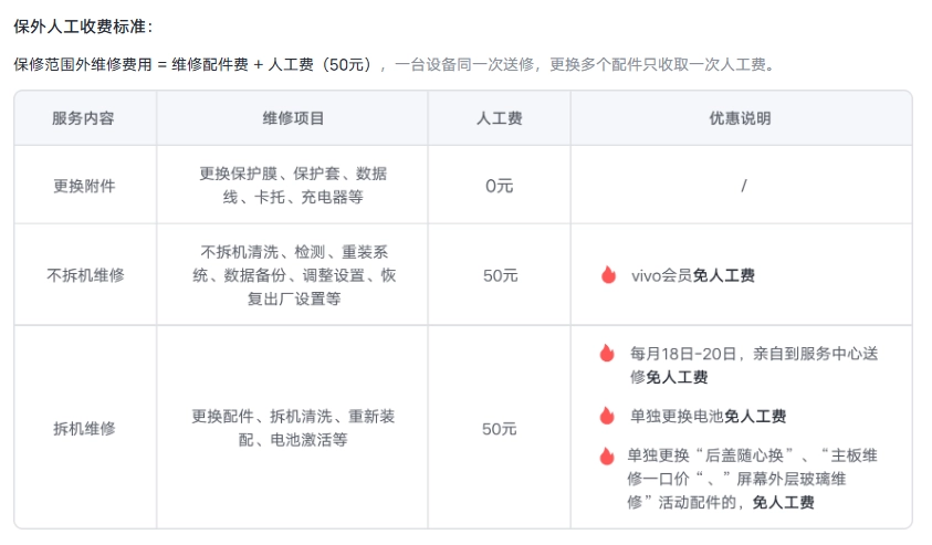 需要注意的是,保修范围外维修费用 = 维修配件费 + 人工费(50 元),一台设备同一次送修,更换多个配件只收取一次人工费。