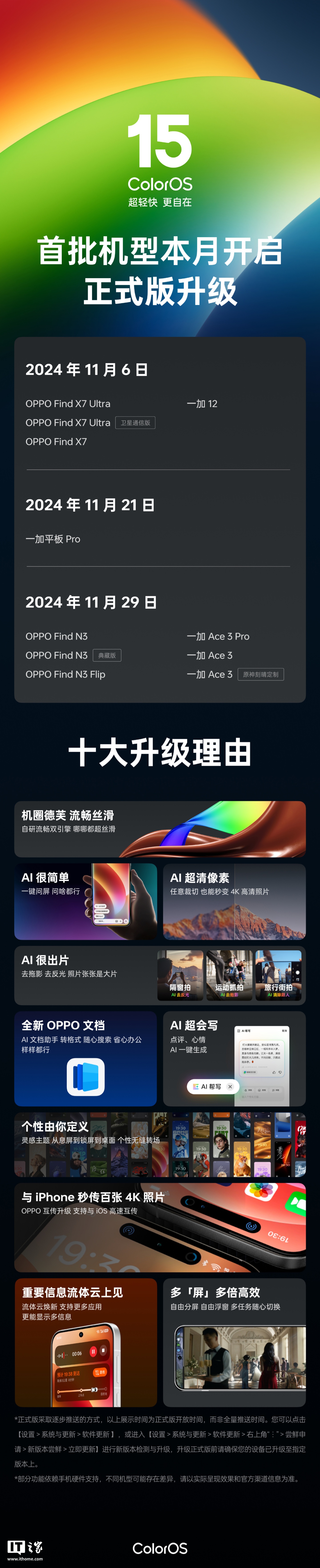 IT之家 11 月 1 日消息,ColorOS 官方今日宣布,首批 11 款机型将于本月开启 ColorOS 15 正式版升级。