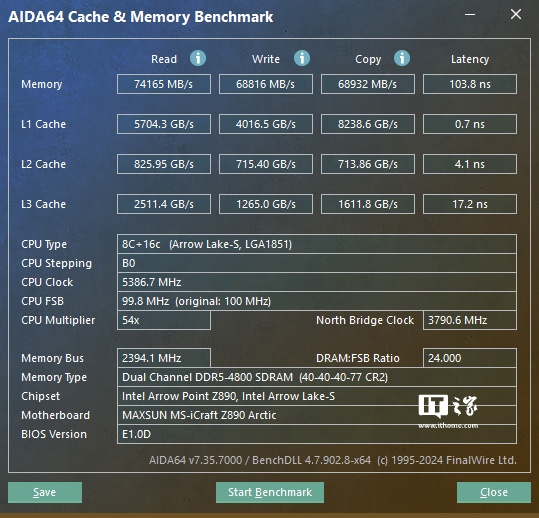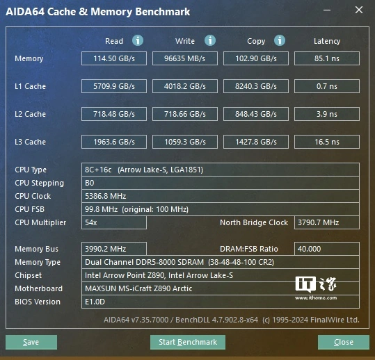 上述成绩属于 4800MHz 频率下的内存正常读写水平,不过大家应该注意到这次的内存延迟受酷睿 Ultra 9 285K 的架构影响,相比上一代 i9-14900K 可能会偏高一点。