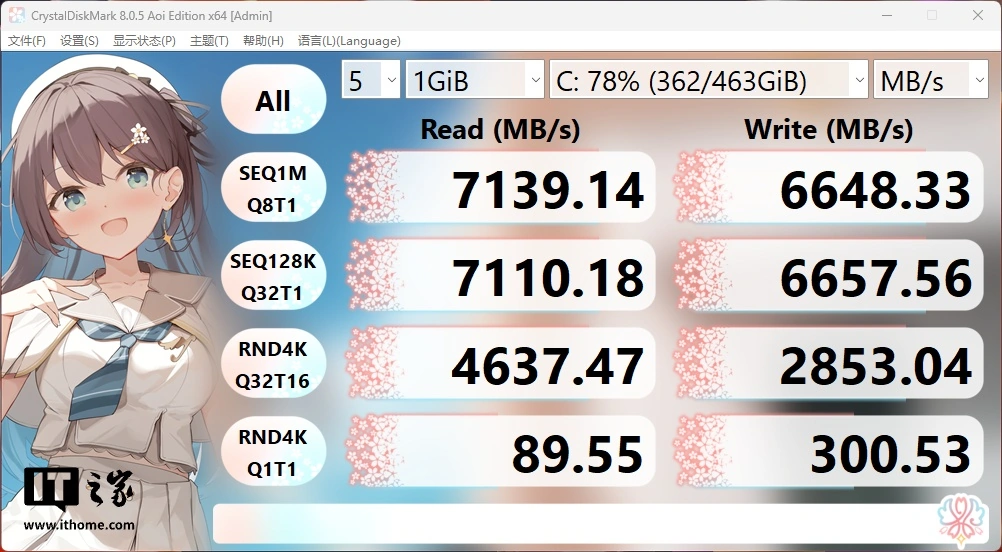 硬盘方面,我们将标称规格为 7450MB/s 顺序读取速度和 6500MB/s 顺序写入速度的雷克沙 NM800 Pro 插在主 M.2 插槽上,在 78% 脏盘的情况下跑到了 7139MB/s 的顺序读取速度和 6648MB/s 的顺序写入速度,符合其应有的水平。