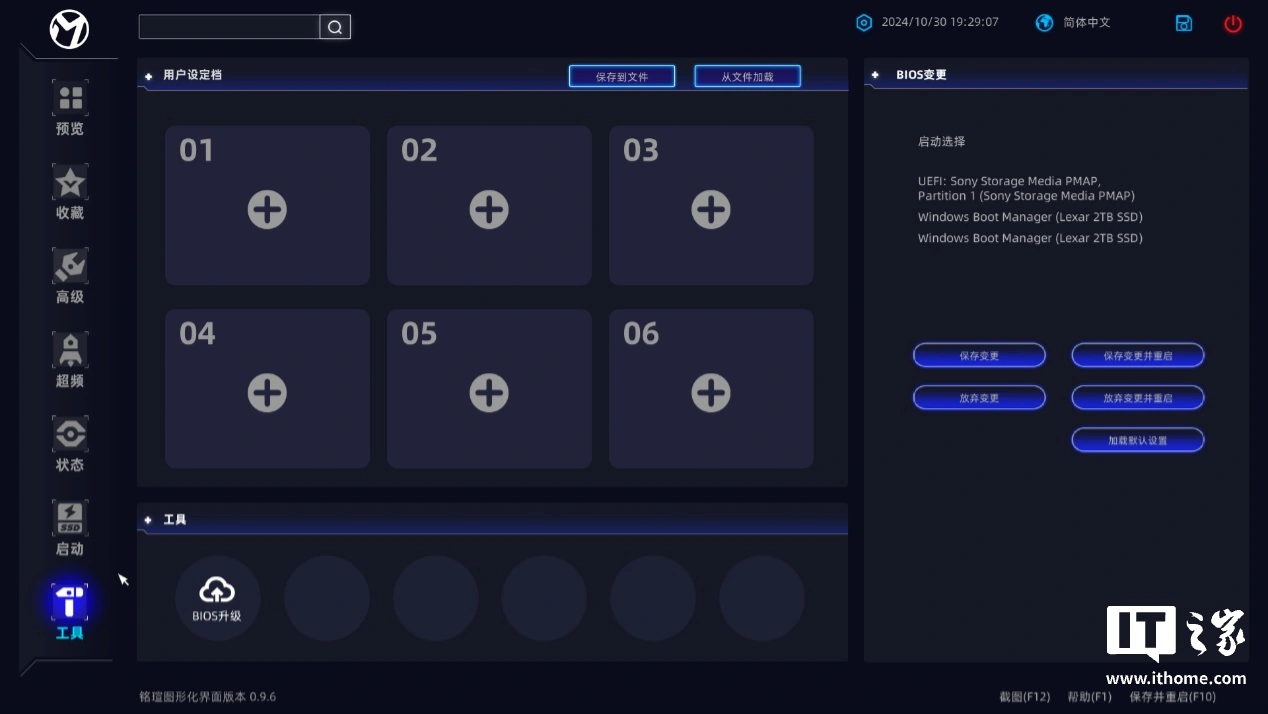 工具选项标签页提供了用户设定档,最多可保存 6 个,还有 BIOS 升级工具。