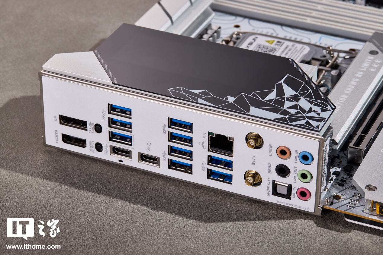 CPU 下方的主 PCIe5.0 x4 M.2 固态插槽和扩展 M.2 区域插槽上方装甲都做了白色涂装和图案设计,稍微遗憾的是两者都还是传统的螺丝固定方式,装机时安装固态硬盘会稍微麻烦一点。