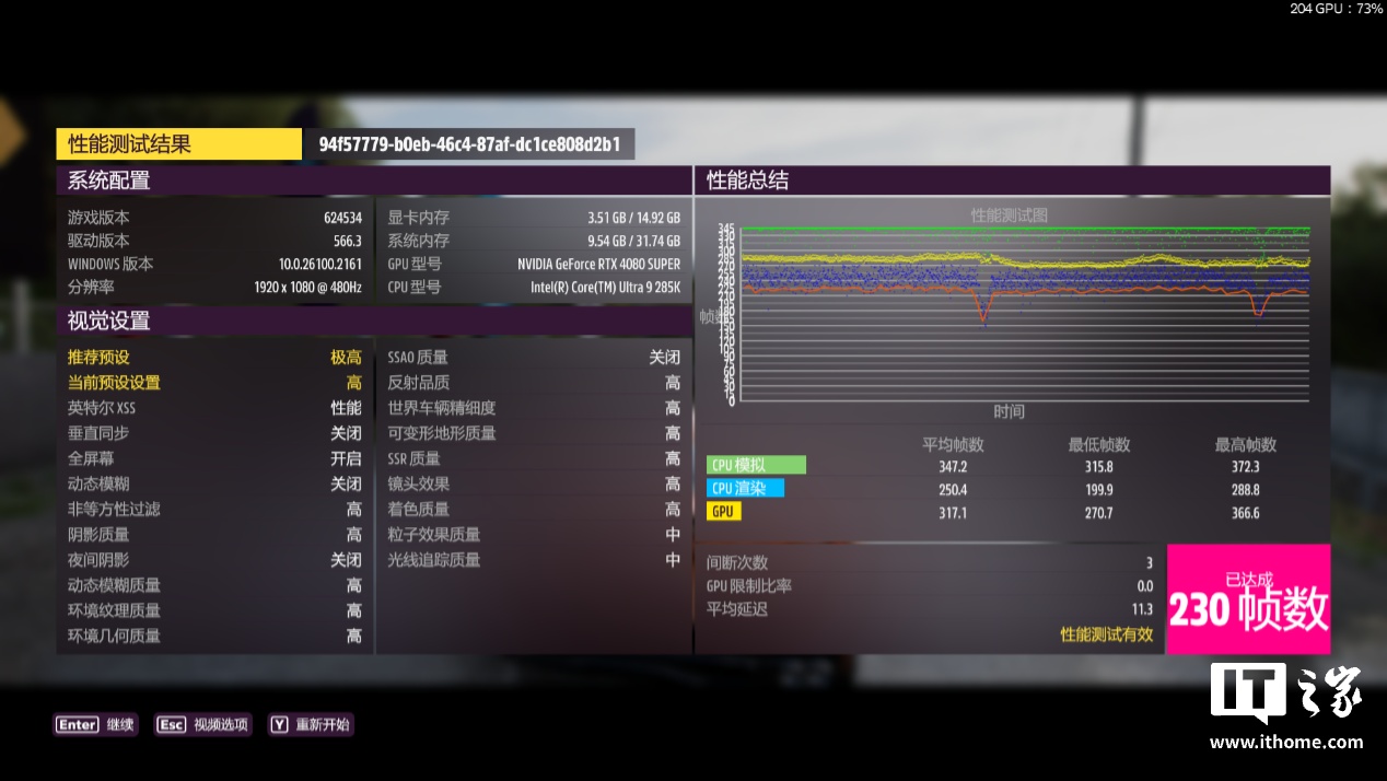 第三款《极限竞速:地平线 5》,选择 1080P 分辨率 + 高画质预设运行游戏自带基准测试,酷睿 Ultra 9 285K 游戏平均帧数为 230 帧,1% Low 帧 179 帧。