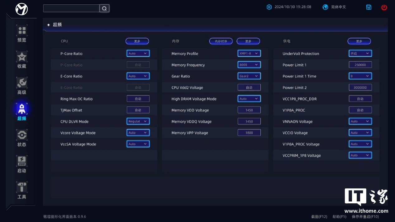 超频标签页要给好评,不仅将超频部分分成 CPU、内存和供电 3 个模块,每个部分的主要超频选项都尽收眼底,省去了翻找的环节。