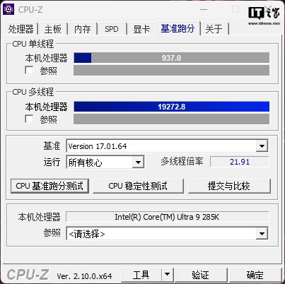 接下来进入理论性能实测,在 CPU-Z 自带的跑分测试中,酷睿 Ultra 9 285K 单核心 937 分,多核心 19272.8 分。
