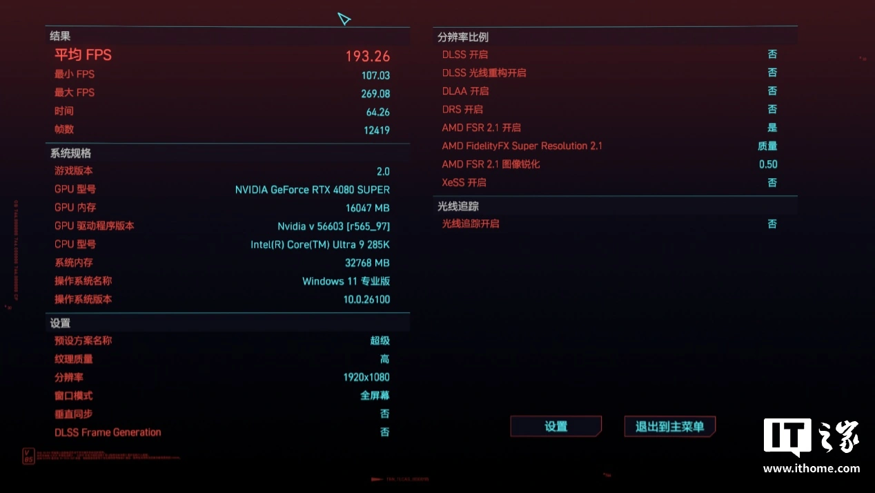 第五款是《赛博朋克:2077》,选择 1080P 分辨率 + 超级画质运行游戏自带基准测试,酷睿 Ultra 9 285K 游戏平均帧数为 193 帧,1% Low 帧 107 帧。