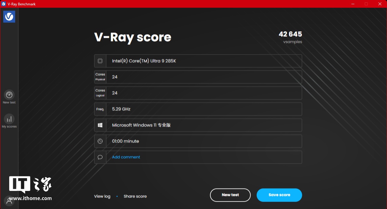 在 3D 渲染软件 V-Ray BenchMark 6 的 CPU 测试中,酷睿 Ultra 9 285K 达到了 42645 分的成绩。