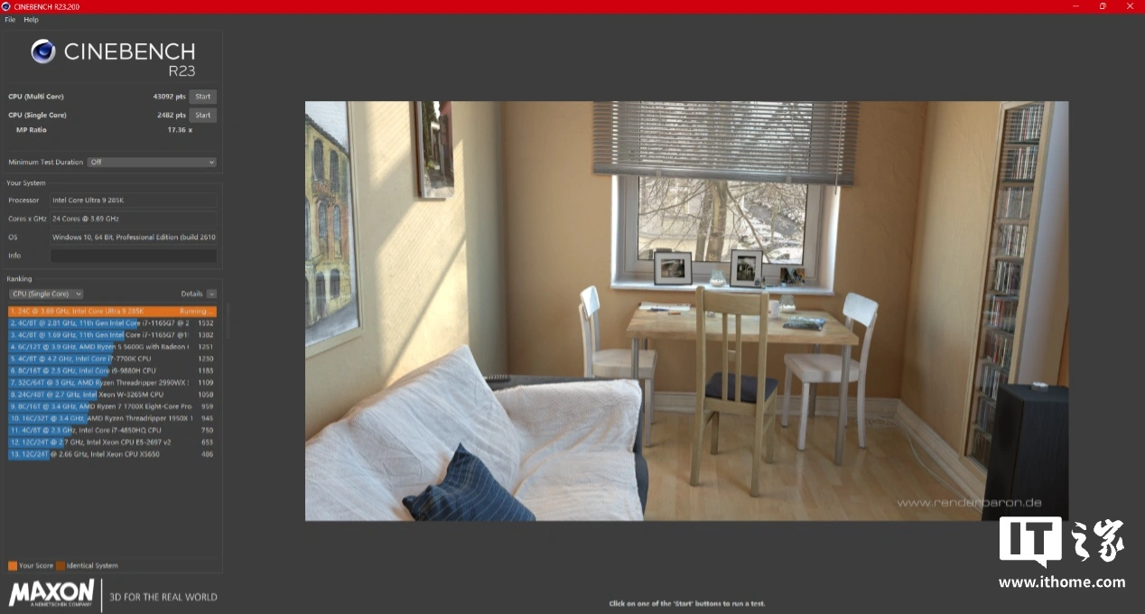 在 CineBench R23 的测试中,酷睿 Ultra 9 285K 跑出了单核 2482 分,多核 43092 分的成绩,单核多核表现都比较亮眼。