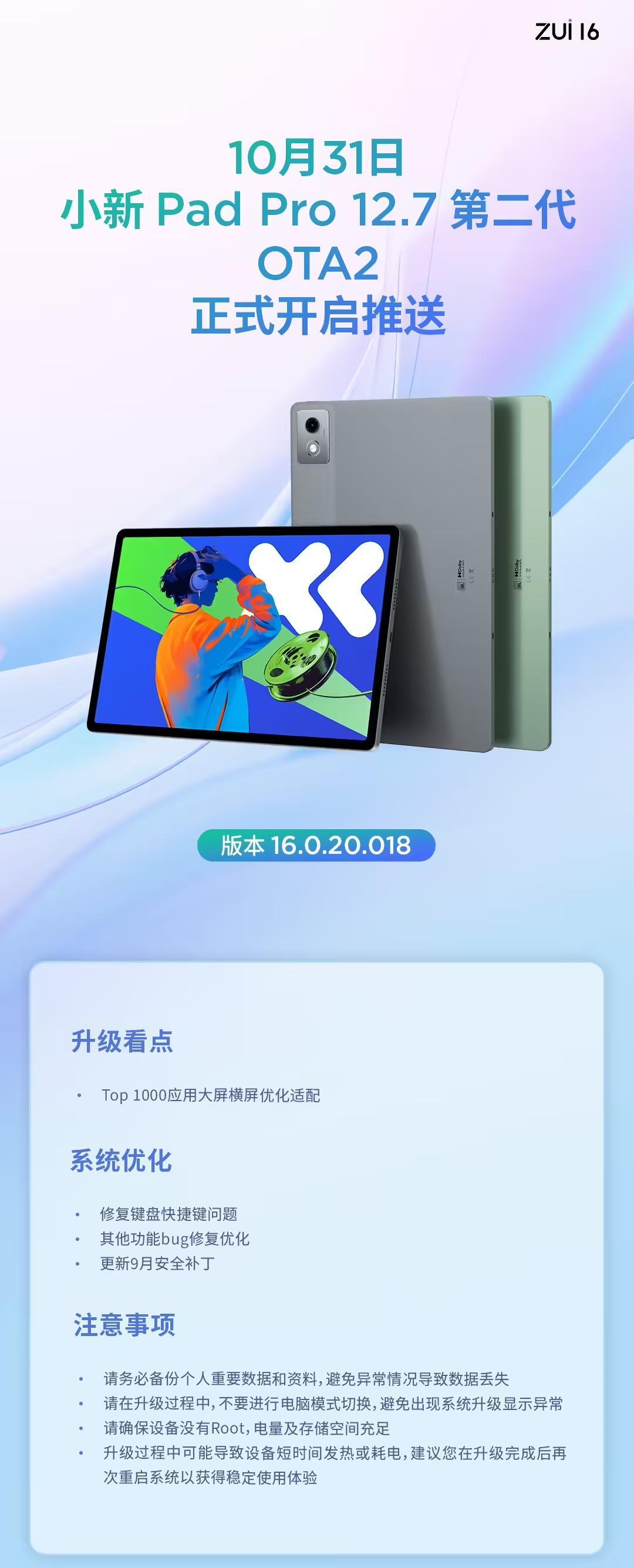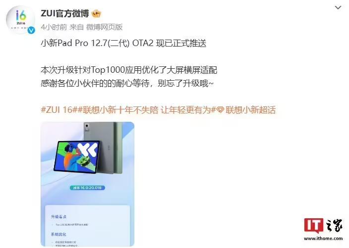 IT之家 10 月 31 日消息,联想 ZUI 系统官方今日宣布,联想小新 Pad Pro 12.7(二代)OTA2 正式推送,新版本对 Top 1000 应用进行了横屏优化。