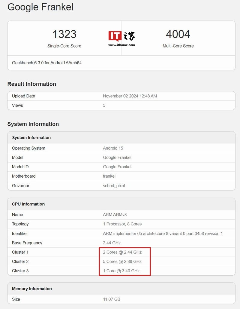 IT之家 11 月 2 日消息,科技媒体 The Tech Outlook 今天(11 月 2 日)发布博文,报道称谷歌 Tensor G5 芯片已现身 GeekBench 跑分库,6.3.0 版本单核成绩为 1323 分,多核成绩为 4004 分。