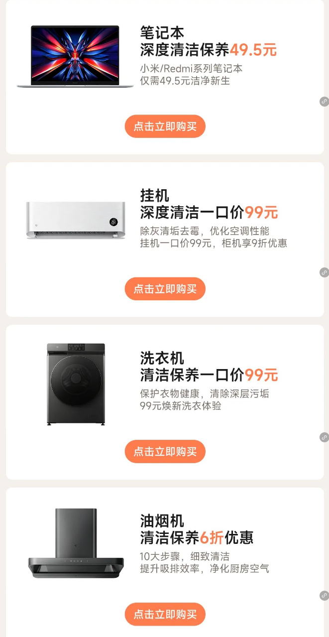 IT之家注意到,小米还推出了笔记本 5 折深度清洁保养,小米 / Redmi 系列笔记本仅需 49.5 元(原价 99 元);小米空调挂机深度清洁一口价 99 元(原价 119 元),柜机享 9 折优惠;洗衣机清洁保养一口价 99 元(原价 119 元),油烟机保养 6 折优惠后 101.4 元(原价 169 元)。