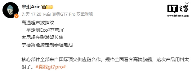 IT之家 11 月 2 日消息,真我 GT7 Pro 手机将于 11 月 4 日 14:00 发布,realme 市场沟通总监 @宋琪Aric 昨日发文称其核心部件全部来自国际顶尖供应链合作,规格全面看齐高端旗舰。